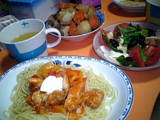 パスタにバジルとトマトのサラダに(何故か)肉じゃがですよー