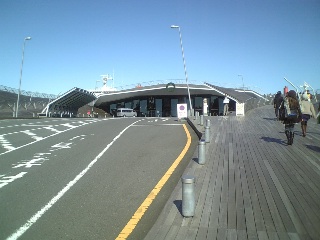 と、とうとう海が見えてきて、テンション更にアップ!目の前がフェリー乗り場の光景のように。あ、右手にあるあの建物が会場??と思ったら違うみたい。