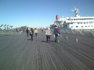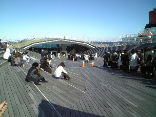 「桟橋」と呼ぶにはあまりにも規模がでかい、木で出来た大桟橋を進みます。おー!!だから「大さん橋ホール」なのか!!ピンヒールだったら、木と木の隙間にはまりそうだ。